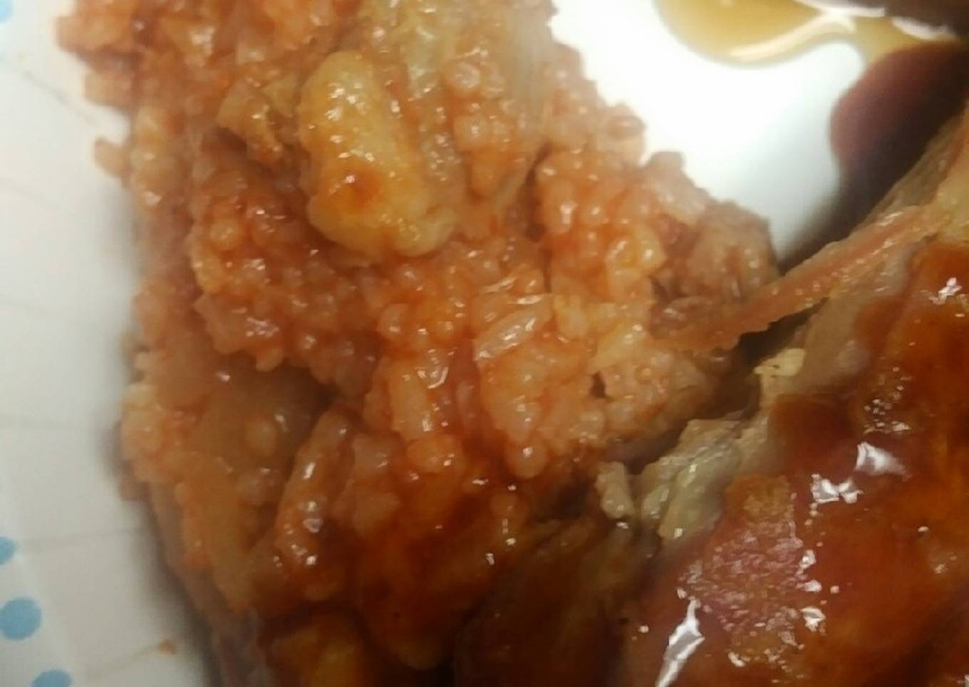 - Trim the meat off the bone and gristle. Add back to the onions. Add rice and water. Break the rice up, mine was in lumps a bit. When it's all simmering add the tomato paste and garlic.