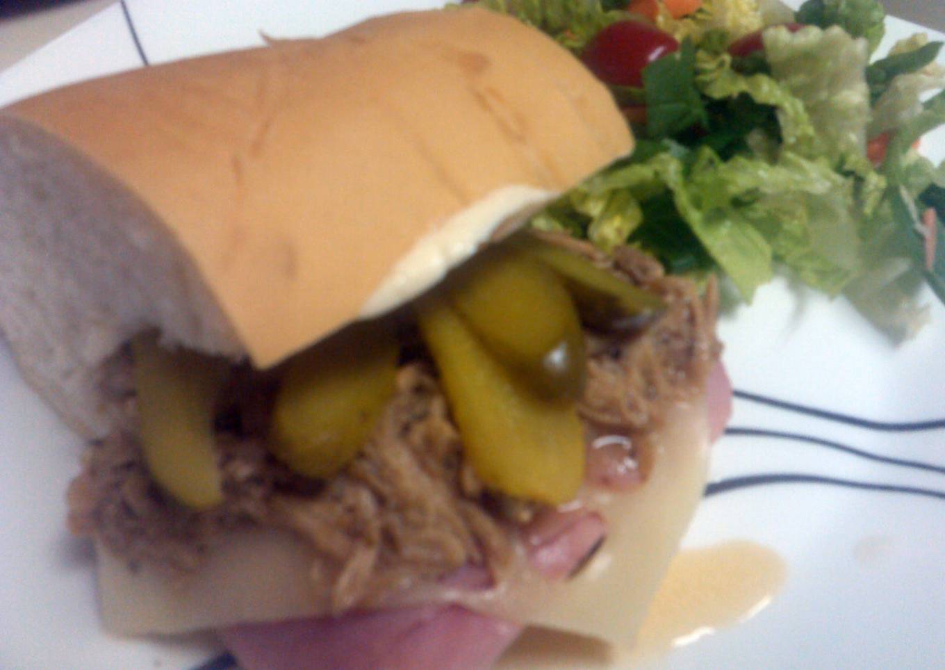 - when pork is ready, in a pan warm up Ham slices, assemble sandwiches with one slice of cheese and Ham,a few pickles and Mayo and mustard as much or as little as you like.