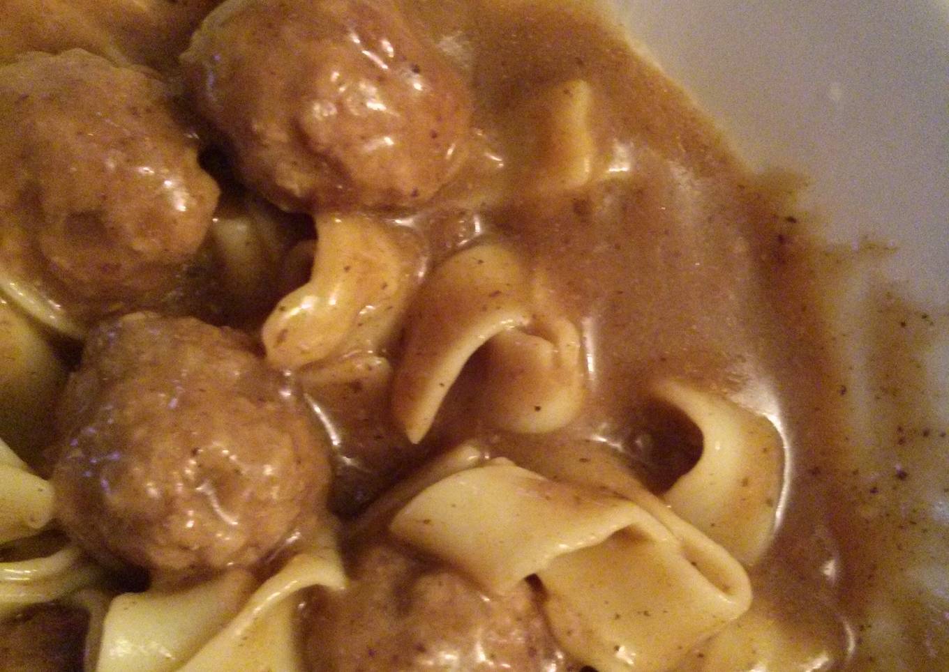 - Once all of the meatballs are cooked, decrease the heat to low and add the flour to the pan or skillet that was used for sautéing the meatballs. Whisk until lightly browned. It will be thick and lumpy. Approximately 1 to 2 minutes. Gradually add about half of the beef stock, raise the heat a little and whisk until sauce begins to simmer and thicken. Add the rest of the beef stock and simmer for 1-3 more minutes. Remove the meatballs from the oven, cover with the gravy and serve over buttered egg noodles.
